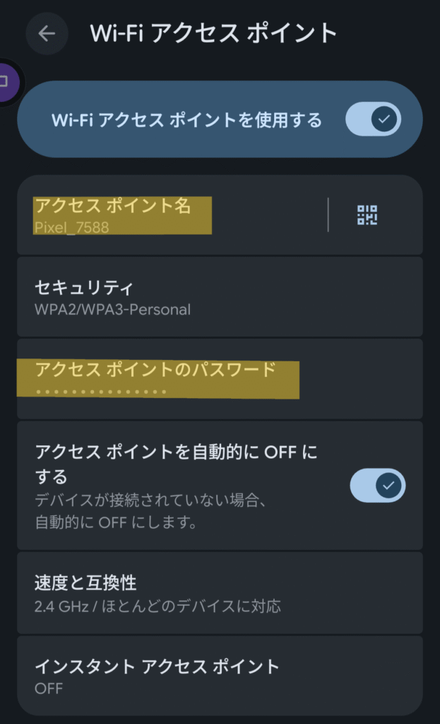 - 「Wi-Fiアクセスポイントを使用する」をONにします。