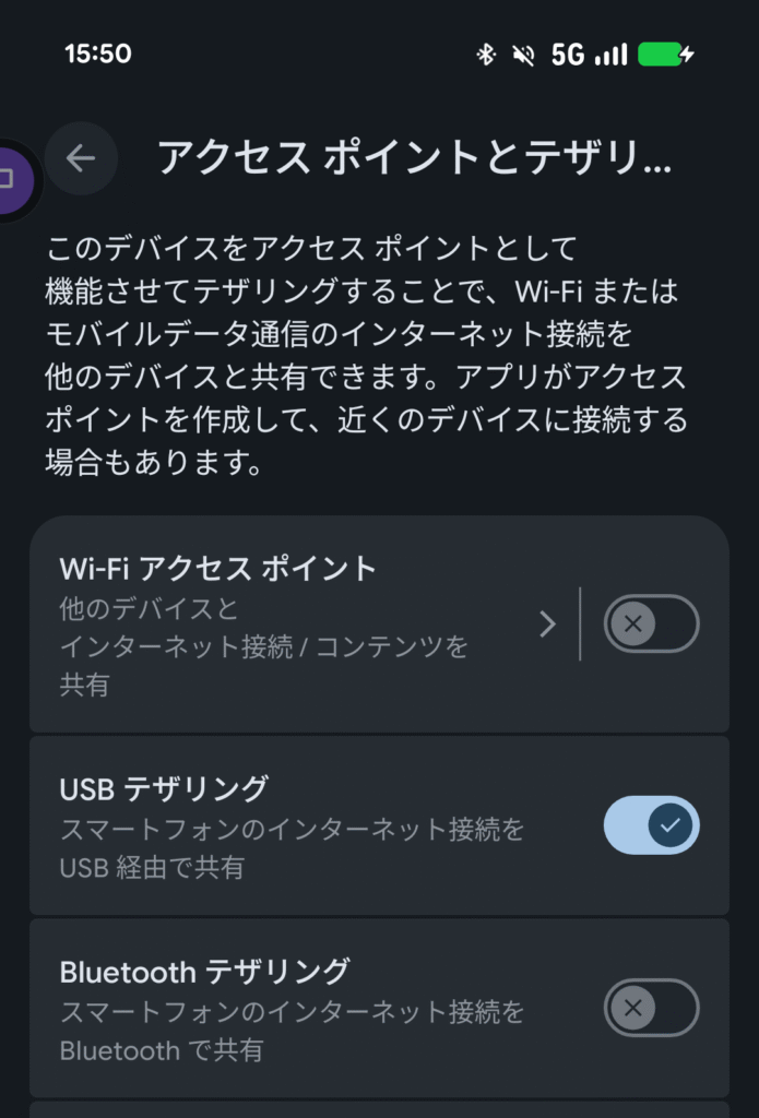 | 比較項目 | Wi-Fiテザリング | USBテザリング | Bluetoothテザリング |